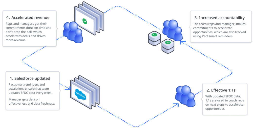 To address these issues, we integrated a combination of smart reminders, escalations and analytics directly into their existing calendar and messaging platforms—something Pact makes very simple to achieve. Our goal was to tackle the problem at its root, increasing integrity and accountability at every level of collaboration. We set up a weekly workflow within Pact to automatically track Salesforce data updates for Bill and his team. This workflow served as a reminder for the team to update their data while also providing timely information about every update, presenting clear analytics to the sales leader, and proactively communicating with the team when someone was falling behind. Pact also enabled the team to track requests amongst themselves effectively, ensuring that the most important tasks were prioritized to pursue key opportunities. The team uses Pact to communicate the critical work required to close deals, vastly increasing the likelihood of those blockers getting fixed with its automated notifications and escalations.