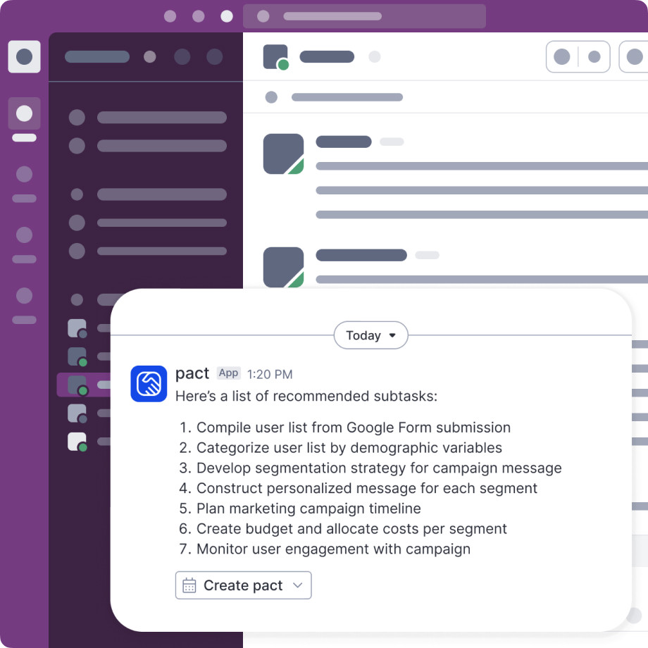 - Pact's AI excels in breaking down large, overwhelming requests into manageable, distributed tasks. This feature is invaluable for working with cross-functional teams, including contractors and external partners.
