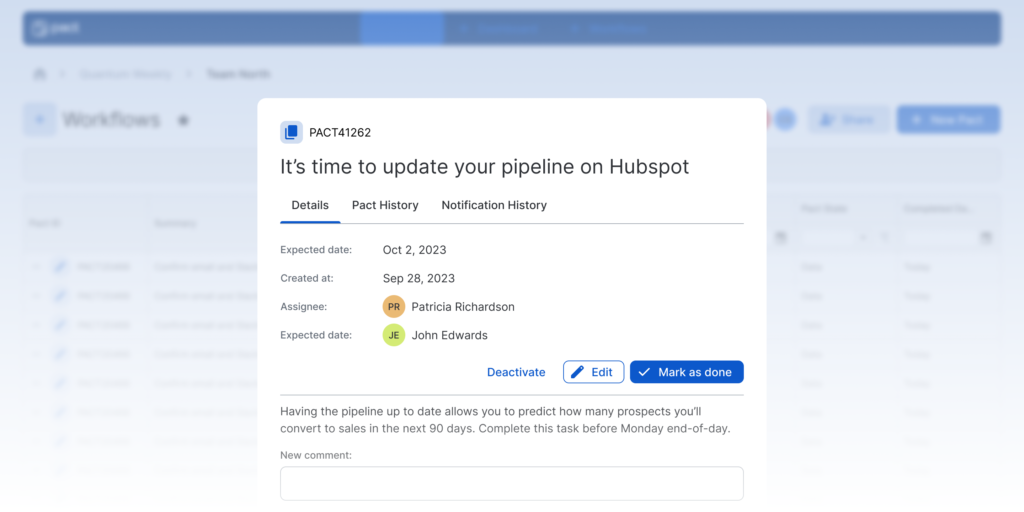 Pact created a simple and highly effective automation for tasks that brought accountability to their CRM update process. That resulted in a 44% improvement in pipeline accuracy, while reducing work for managers and sales reps. The solution involved: