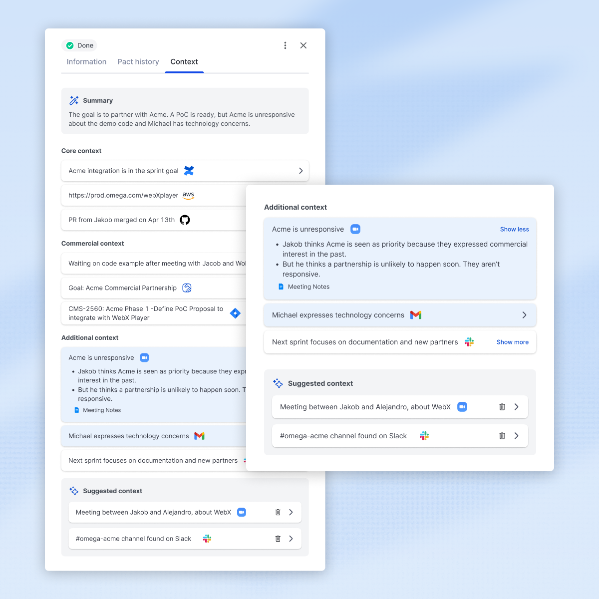 - Smart summaries and context: AI-driven management provides critical data and timely context, ensuring no balls are dropped and keeping you up to date continuously on all work that could block your most important goals.